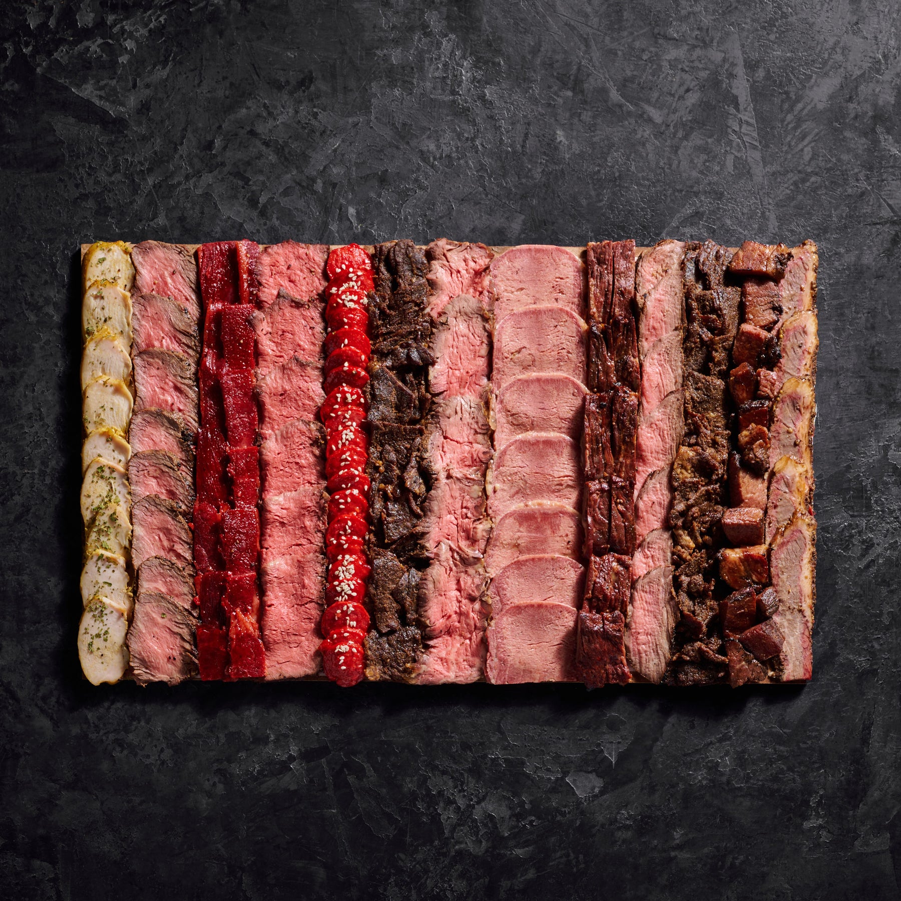 Chicken, Rib Eye, Facon, Pepper Crusted Rib Eye, Kielbasa, Jerky, Surprise Steak, Tongue, Skirt Steak, Oyster Steak, Spicy Jerky, Pastrami, Smoked Brisket